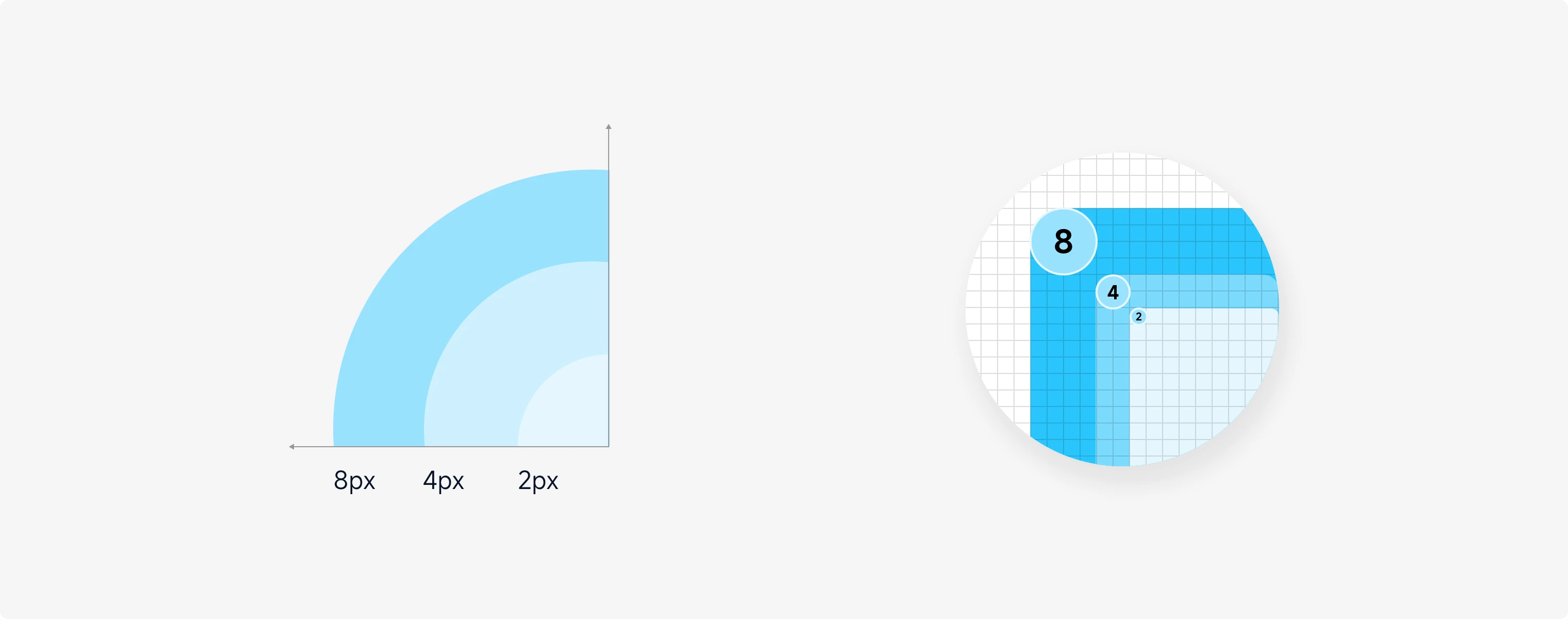根据界面密度原则,布局越密集,所需的圆角尺寸就越小,因此PC制作3种圆角,来对应不同界面不同的密度,界面排列,重组等不同的复杂情况,根据视觉差异带来不同圆角的视觉差异,由此通过定义限定数量的圆角尺寸,从而解决各端界面通用型问题。