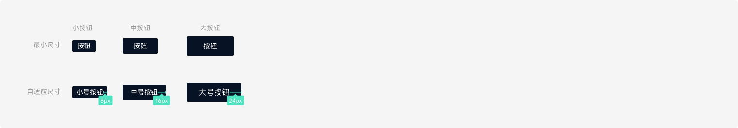 2)根据文字内容,按钮宽度自适应:小按钮固定间距为8px;中按钮为16px;大按钮为24px