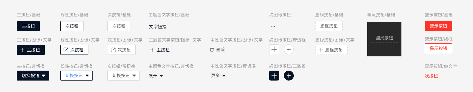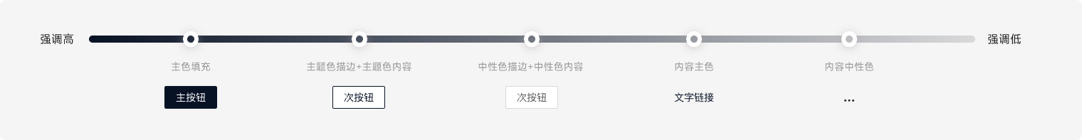 常规按钮类型呈现出不同的强调程度,使用者可以据此变化出合适的按钮类型