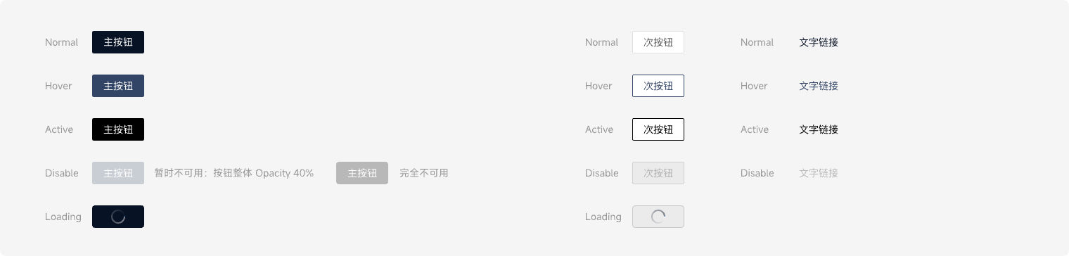 ● 文字按钮:弱化的按钮,采用更轻量的按钮样式,可用于需大面积展示按钮场景,例如表格组件中的操作列