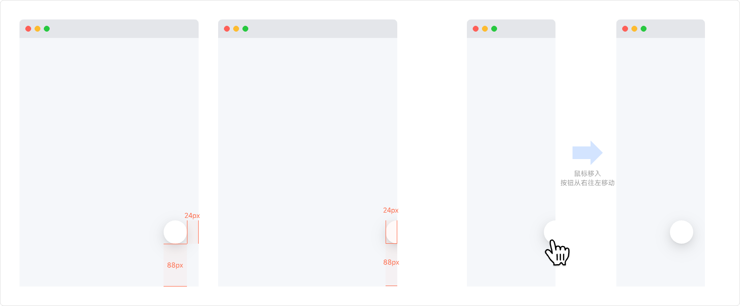 一般位于页面右下角,支持固定展示,或鼠标移入呼出展示。位置支持自定义,但允许遮挡操作。