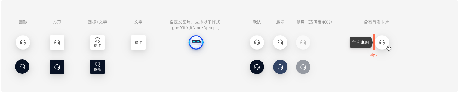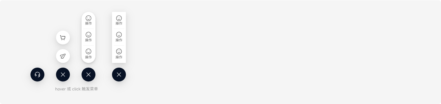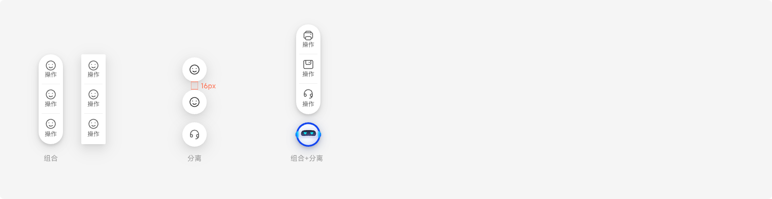 支持不同形式的悬浮按钮组合。一般建议按钮有成组或相关性时,采用组合式 。按钮较为独立时使用分离式