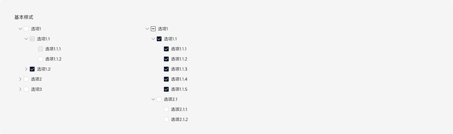 针对有多级分类的内容进行选择,最简单的用法,展示可勾选,可选中,禁用,默认展开等功能。