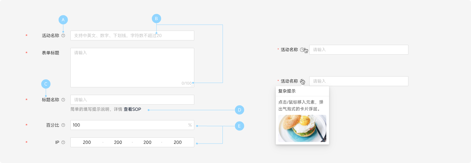 ● E、前后缀单位符号:通过框内占位符或辅助信息提示填写规则,如:分割点、计量单位等提示内容格式