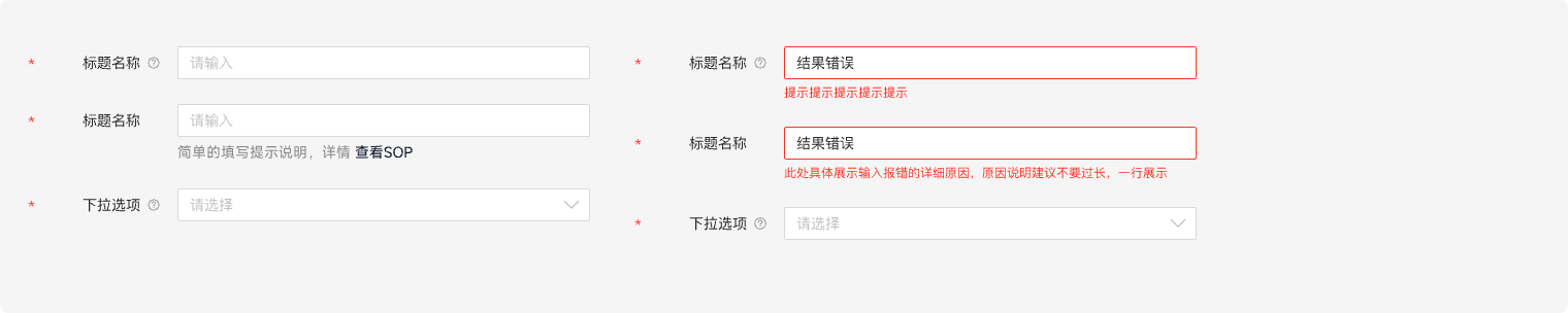 表单填写错误时会出现报错,并在表单下方出现错误提示。若原表单下方有提示,则错误提示可以覆盖原提示,表单重新输入时,错误提示变回原提示文案。