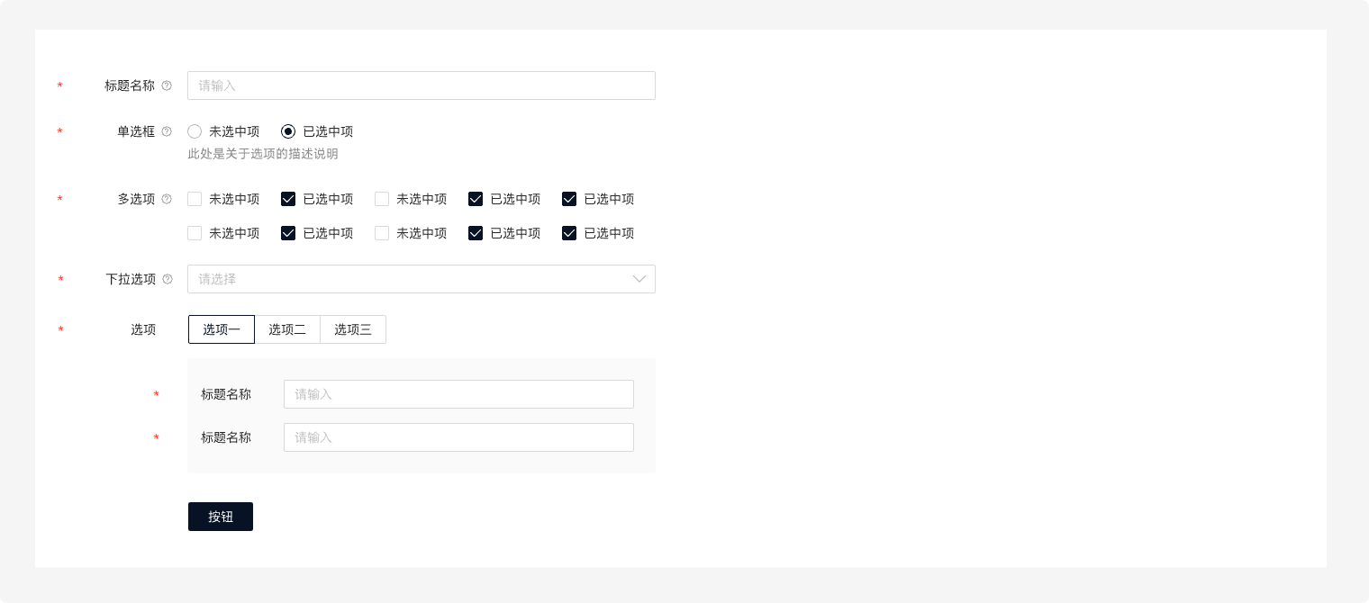 样式:一般情况下标签文字和选项左右排列,如若横向空间较小,或处于布局考虑,可采用上下排列