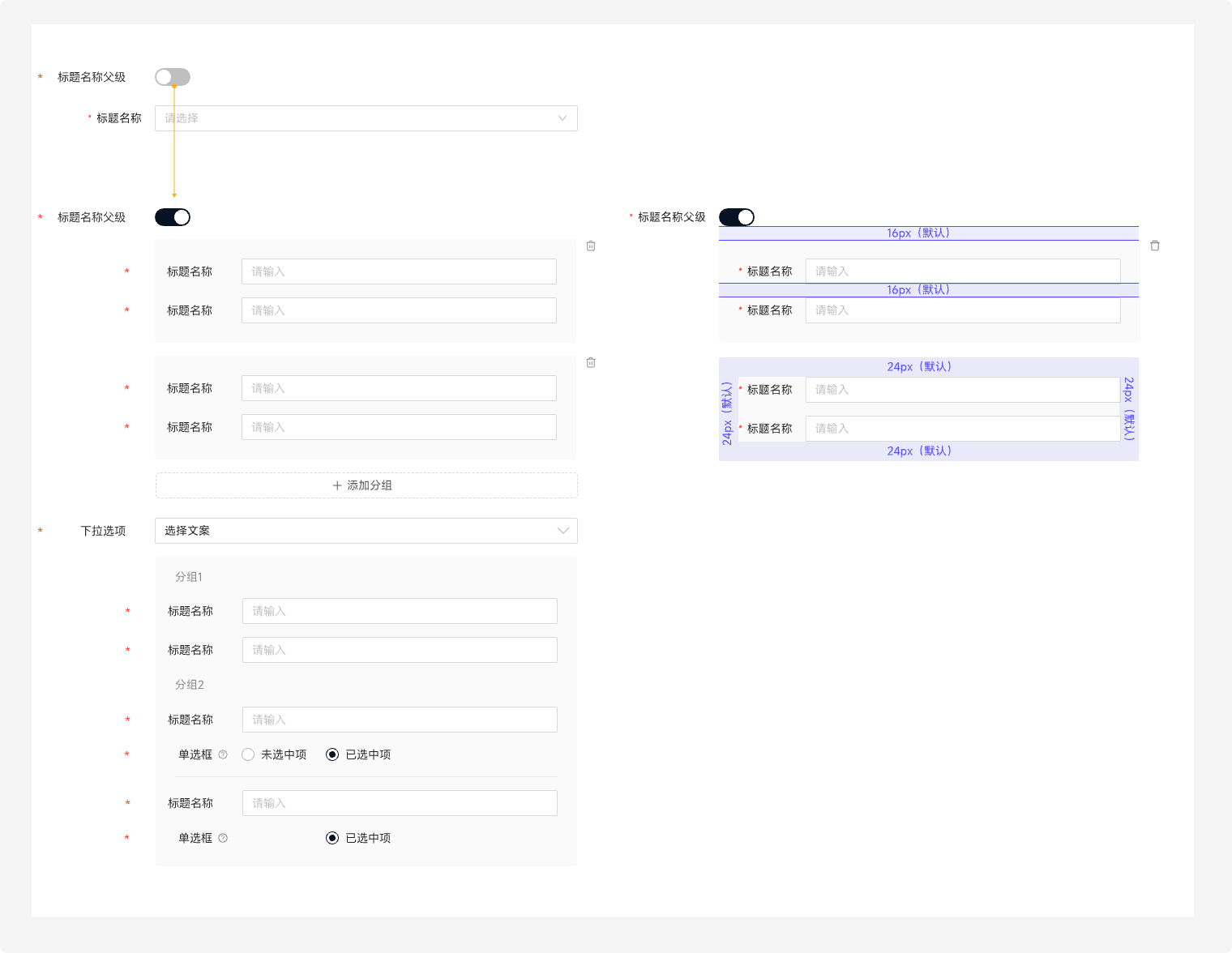 某些情况下,某些表单项由于用户操作不同,会触发父子级内容的联动,例如:switch打开或者关闭,选择器的选项不同呼出不同的联动效果等。