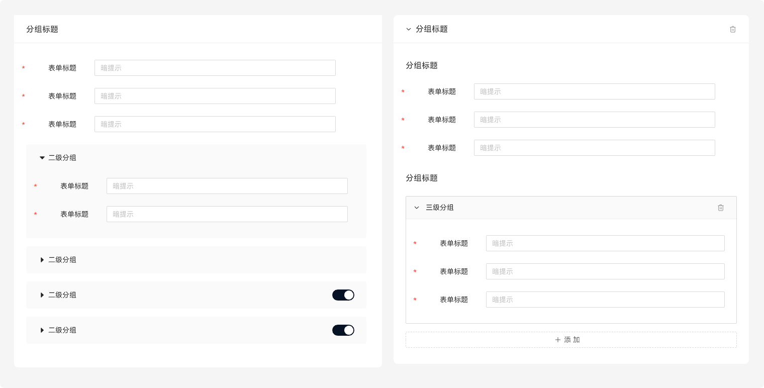 ●若子级还需进行内部分组,则需要分组标题时使用分组标题,没有分组标题时使用分割线