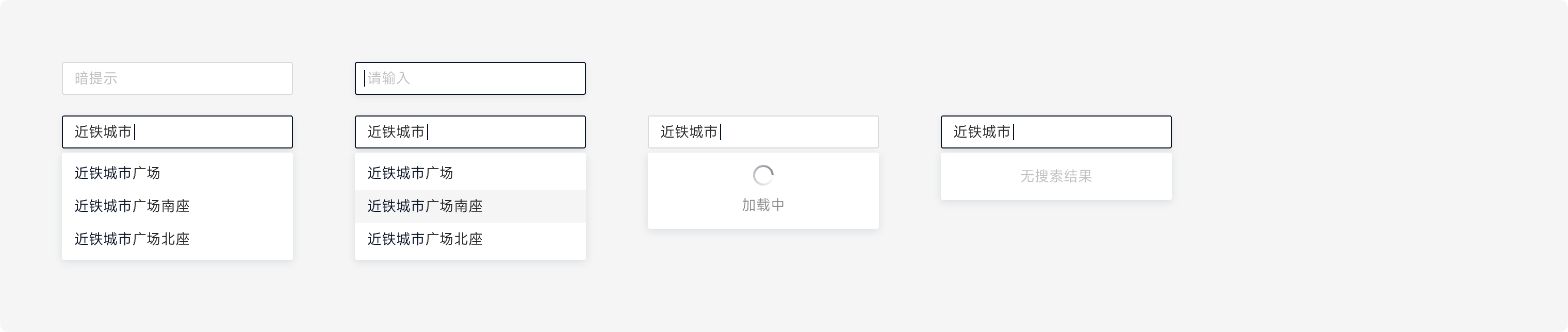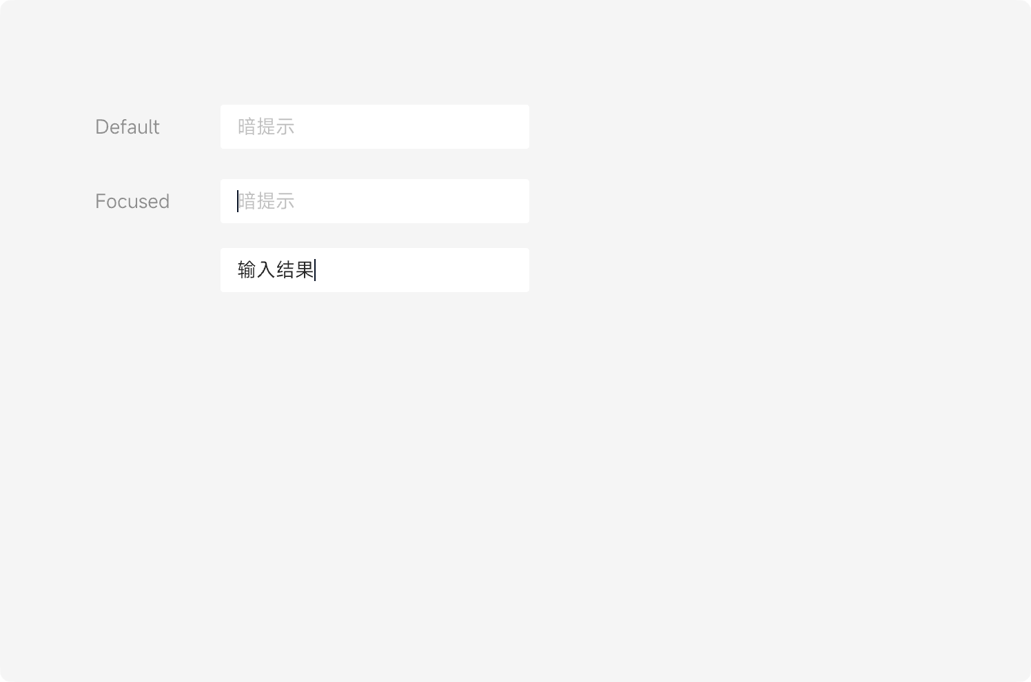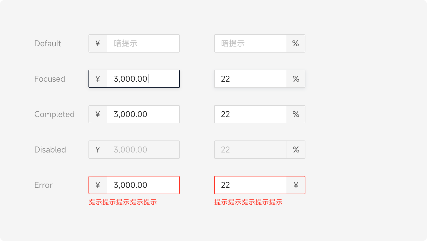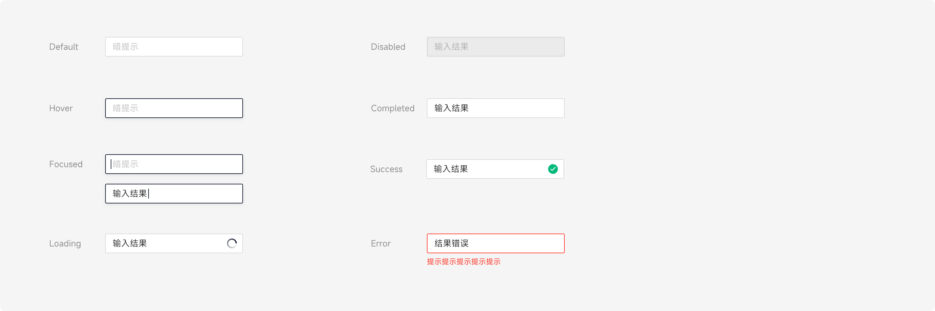 输入框共有 7 种不同的状态,分别为:默认态、选中态、完成态、禁用态、加载态、成功态、报错态