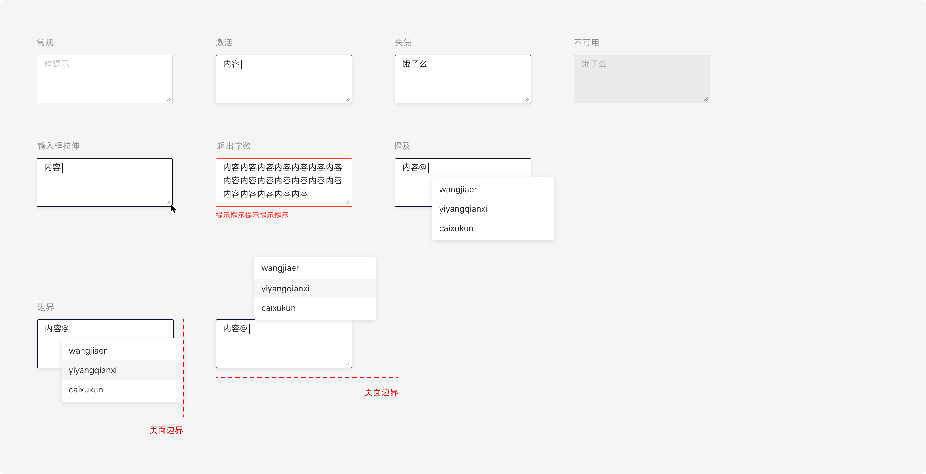 常规,激活,失焦,不可用,拉伸(输入框可拉伸),超出字数,提及,字数提示(非必选)