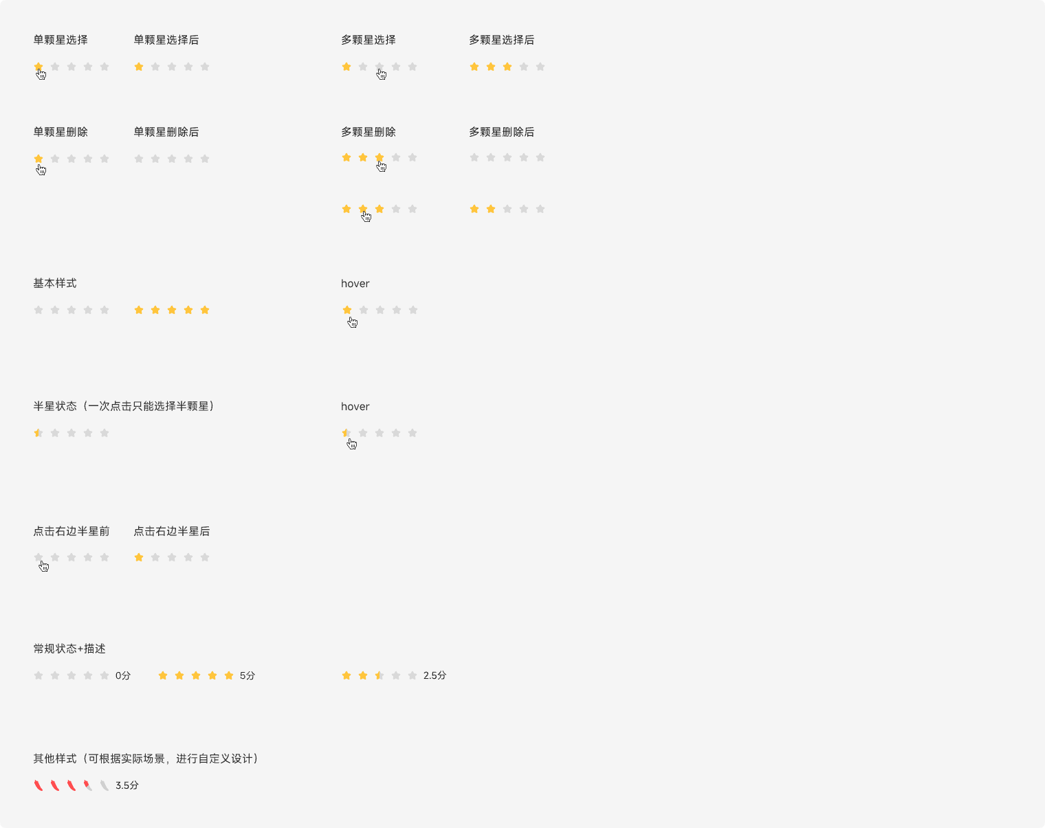 评分组件的使用场景分为操作型与展示型,用于录入/展示等级等相关的业务场景,如辣度/评分等等。支持半分评分;支持只读不可编辑状态。