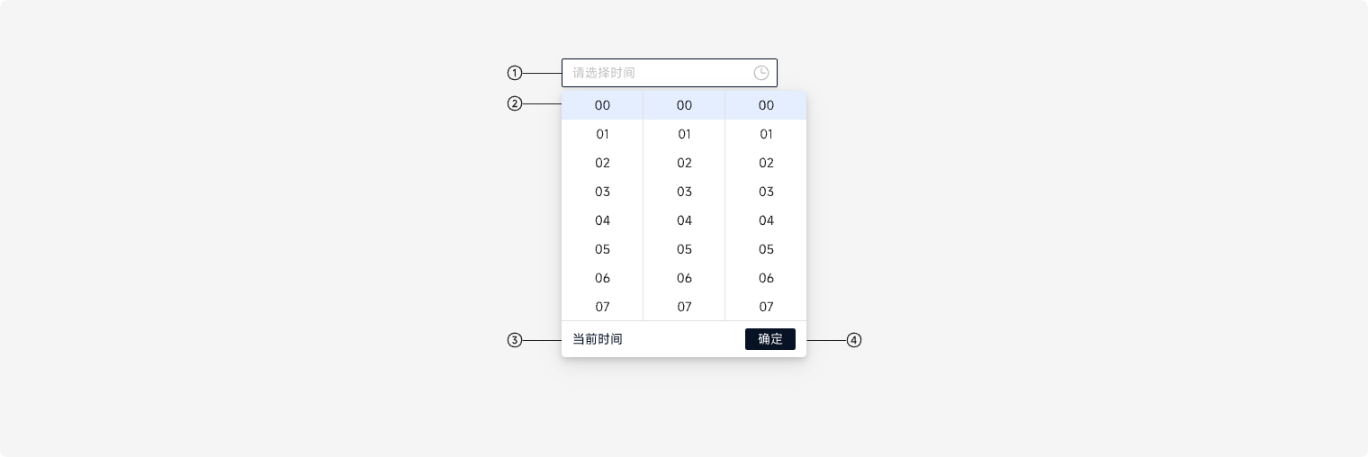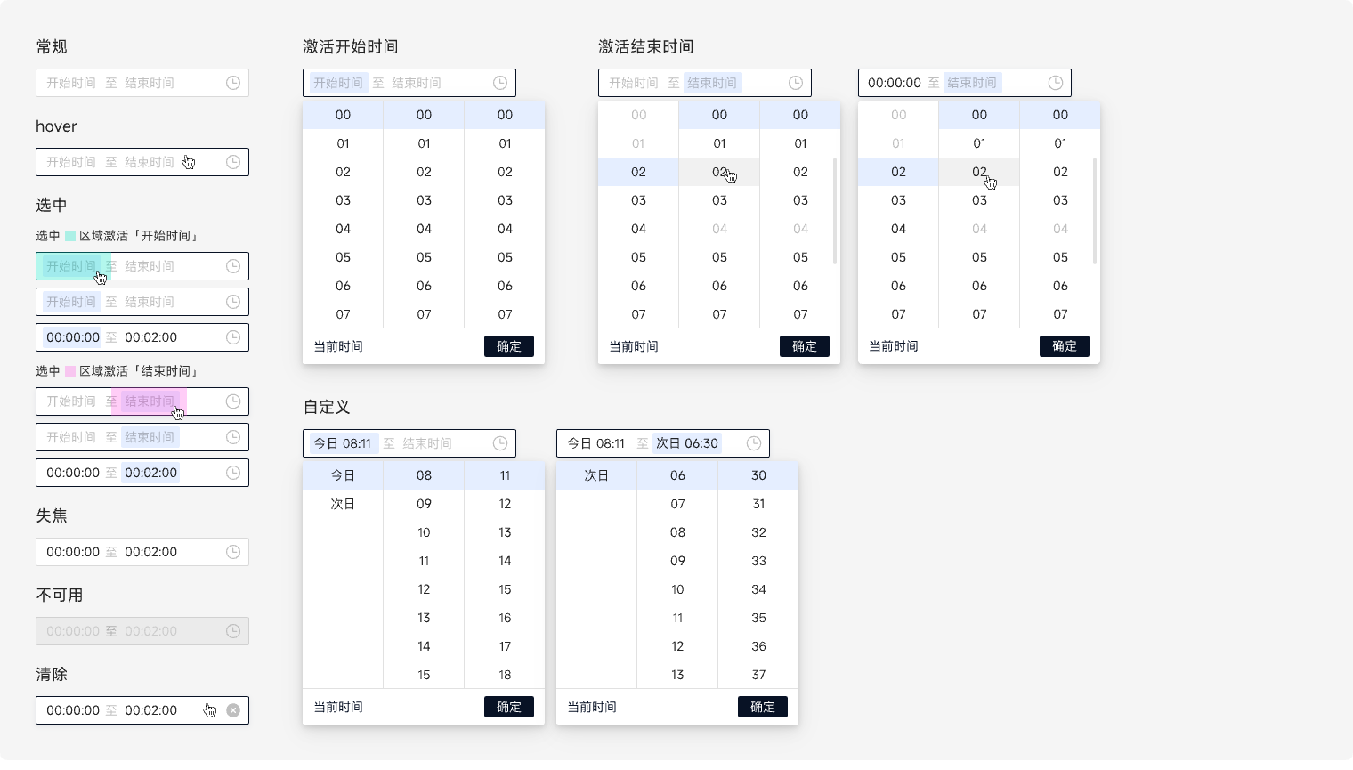 常规、Hover、激活(一般默认定位在00:00:00,可根据业务情况定义默认时间,若最前面的时间为不可选状态,默认定位则顺延)、选中、失焦、不可用。 选择相应的时分秒,滚动定位至顶部被选中位置。点击确定,确定选择选中时间。 完成开始时间后,选中「结束时间」或点击「确定」,保存开始时间设置;完成结束时间后,需点击「确定」后,保存结束时间设置。