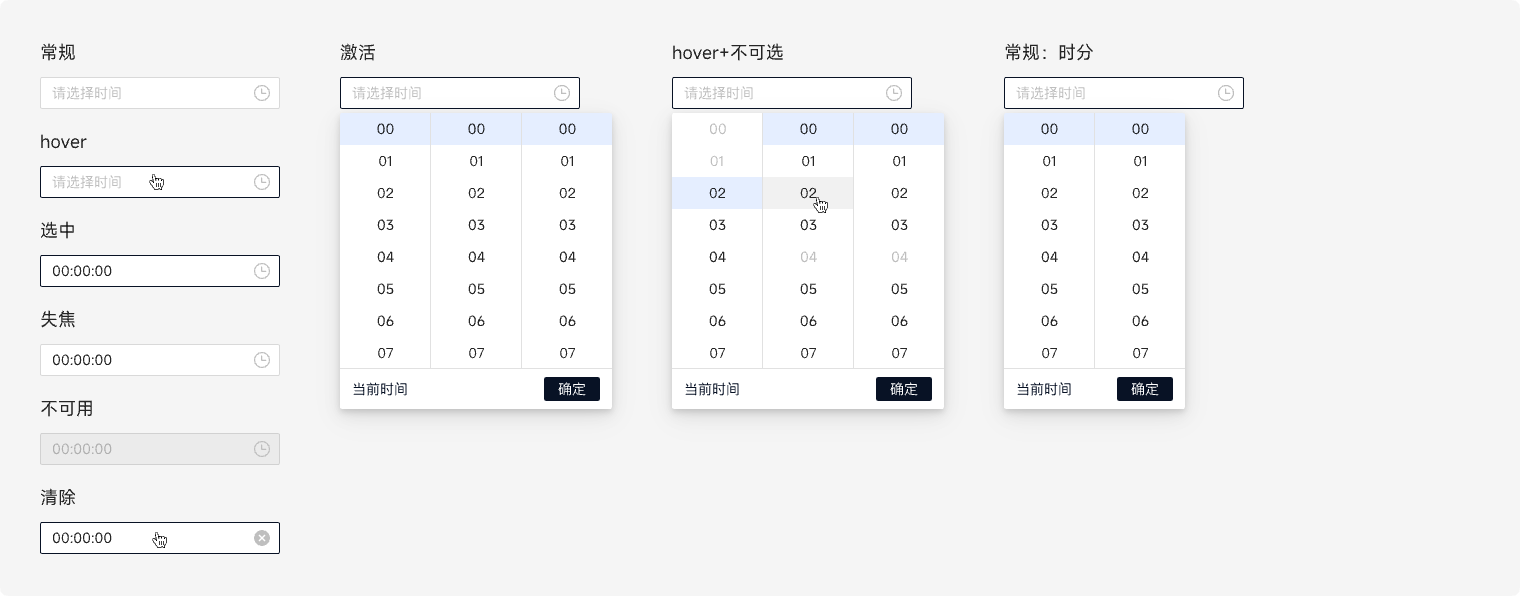 常规、Hover、激活(一般默认定位在00:00:00,可根据业务情况定义默认时间,若最前面的时间为不可选状态,默认定位则顺延)、选中、失焦、不可用。 选择相应的时分秒,滚动定位至顶部被选中位置。点击确定,确定选择选中时间。