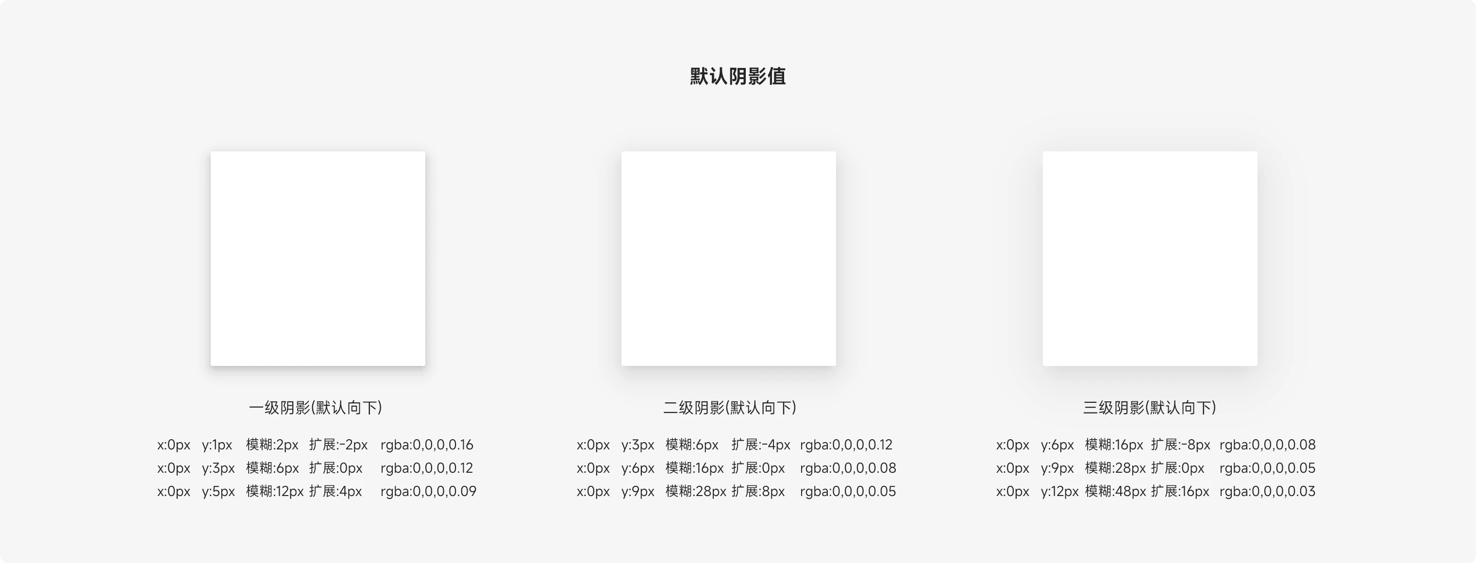 DMS Design 为了更符合真实阴影,采用了三层阴影的表达方式,让阴影更接近真实状态, 按照阴影从深到浅依次分为一级阴影、二级阴影、三级阴影, 默认阴影值为二级阴影值,其他两级阴影值, 设计师可按照具体 显示情况,自行搭配使用,例如遇到组件或界面的现实出现双重叠加,导致显示不清楚的时候,可采用多级并用的阴影形式进行设计,阴影向上、向左、向右阴影可按照实际情况进行设计效果调整。